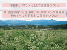 福井先生は、現代農業を中心に昭和村の諸特徴を整理するとともに、「地域づくり」「ブランドづくり」の問題点抽出から成功へといたった全国のまちづくり事例を紹介し、明晰な分析を示された。全国に誇れる「営みの風景がひろがる村」として昭和村を捉え、その要因を住民、自然環境、風土、そして農業生産から分析することをとおして、地域ブランドの重要性と必要性を指摘した。ブランド化はトレンドの影響を受けにくく、村の個性を発信しうるものなのである。農業を取り巻く状況は厳しさを増している。昭和村ではその危機への意識が弱い点が指摘された。昭和村の農業は豊かではあるが、それを持続させることを考えていかなくはならない。このような公益的な事業は担い手が住民であり、その視点から自らの足元を見直すことが必要となっている。そうしてみいだされる個性を活かすことが将来への希望を創りだすのである。均衡ある発展が、地域が個性を喪失している現在、地域再生の鍵となる。地域資源(昭和村の場合は、農業だけで無く歴史的景観や生活文化そのものが地域の魅力としての地域資源である)をまちづくりに結びつけた事例から理解されるのは、「人を呼ぶ」のではなく「人がくる」ようにその資源を活かす仕組みを造ることといえる。「地域の個性を生かすと、農産物の価値が上がる。」本質を読み取り個性を生かすことが価値を高めると説いた。